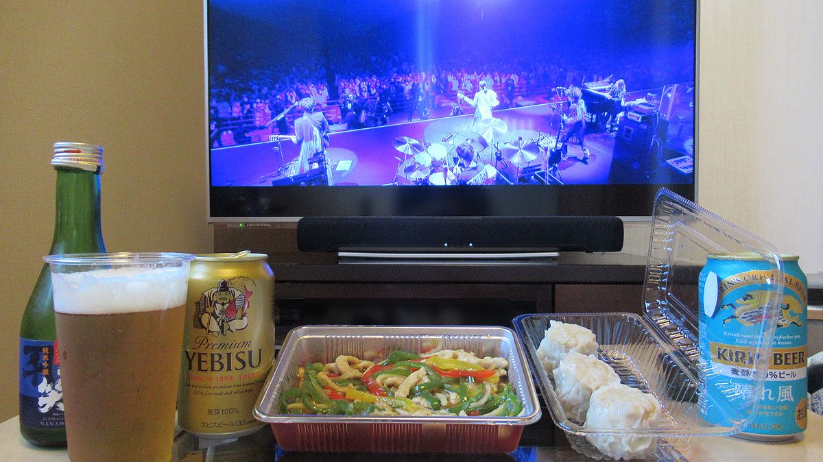 お供はとんとんの青椒肉絲と焼売。おうちライブハウスだ。