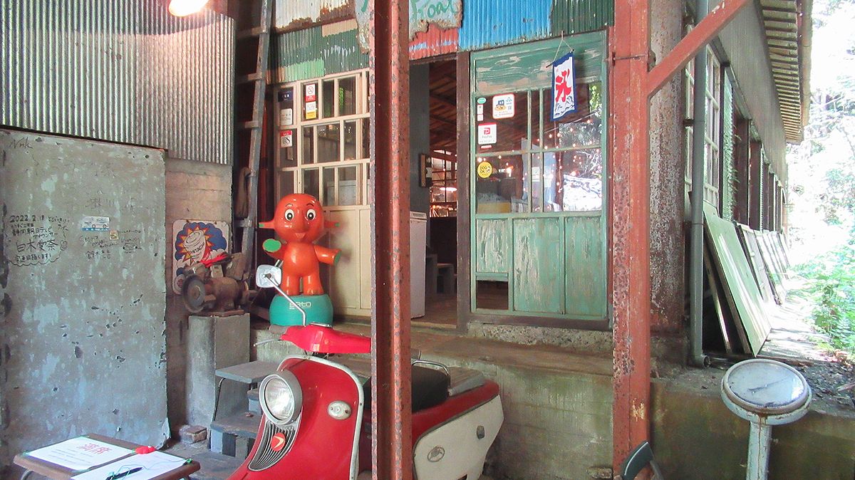 古い広告看板や生活雑貨、車やバイクに囲まれ、