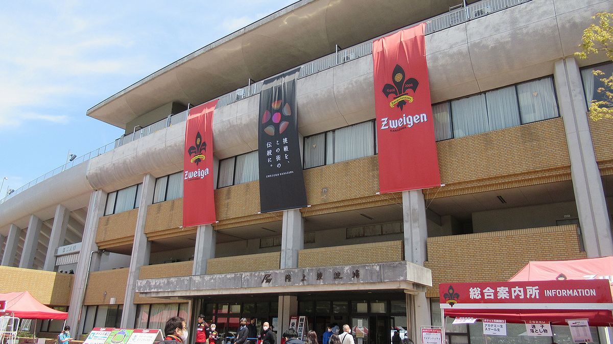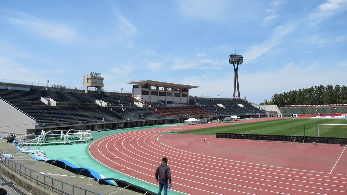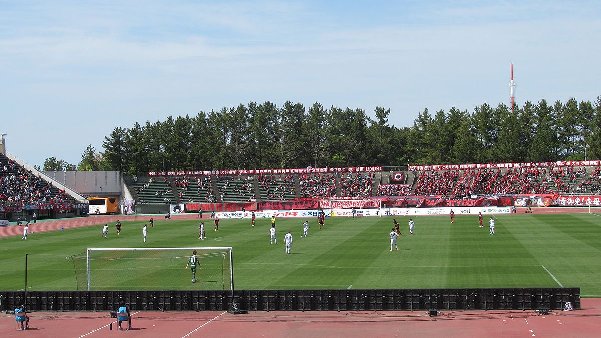 駅からは15分程度で着いたでしょうか。石川県西部緑地公園陸上競技場です。しかし・・・ここを訪ねるのは今回が最後になるかもしれません。金沢市が建設中の北陸初フットボール専用スタジアム「金沢スタジアム」が今秋完成予定とのことで、ツェーゲンもそちらに本拠地を移すとか。