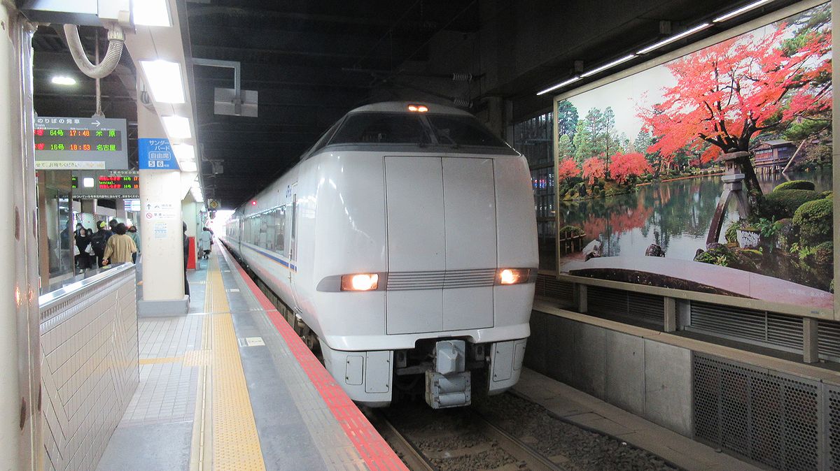 先ほど、今のスタジアムもこれが最後、みたいな記述をしましたが、こうして在来線特急「しらさぎ」で金沢を訪ねるのも最後になるのかもしれません。こちらは「しらさぎ」で金沢駅を出発したところの風景なのですが、並行して北陸新幹線の高架が西へと続きます。この新幹線の高架はこの先も近づいたり離れたりしながらずっと進んでいきます。2024年春のダイヤ改正で北陸新幹線は敦賀まで延伸する見込みで、そうなると金沢へ在来線特急が乗り入れることはなくなります。「しらさぎ」も大阪から来る「サンダーバード」も敦賀まで。「しらさぎ」は米原・敦賀間という短い区間だけの利用になるのでしょうか。(名古屋から乗ればいいのか。)