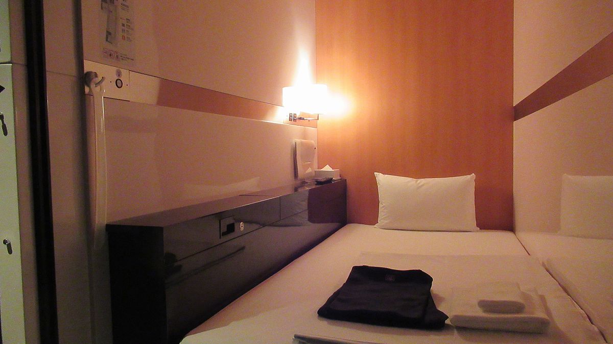 カプセルですが、いわゆる「上下」がない一段式です。その分、カプセル内で立って着替えができます。ただ、カプセルホテルによくある「ロッカールーム」がありません。荷物は自室に入れるスタイルで、着替えも自室で行えるのですが、荷物を置く場所がない(^^;) 私のようにリュック一つの人は横のちょっとした台(この中に鍵付きの貴重品入れがある。)の上に置けますが、大きなキャリーバッグできた人はどうするのだろう。