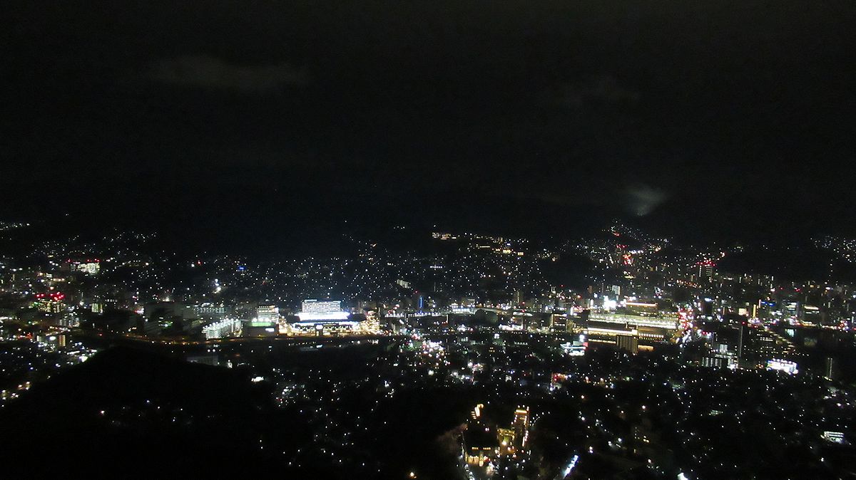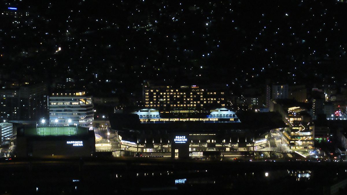 稲佐山展望台から臨む「世界3大夜景」の一つにも選ばれている長崎の夜景です。その中心に鎮座し、存在感をアピールしているのがピースタを中心とするスタジアムシティ。