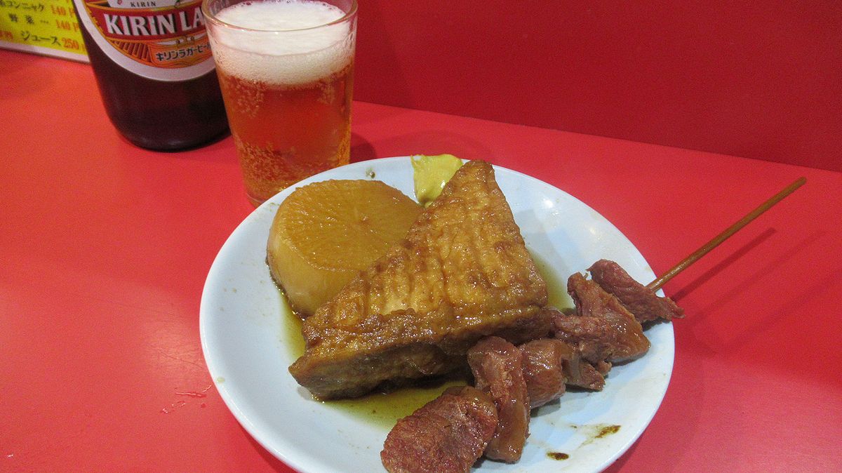 まずはおでんとビールなど。大根に厚揚げ、そして牛すじです。静岡おでんとはまたちがう、かつおなどのだしよりも醤油が強い味付け。でも美味です。