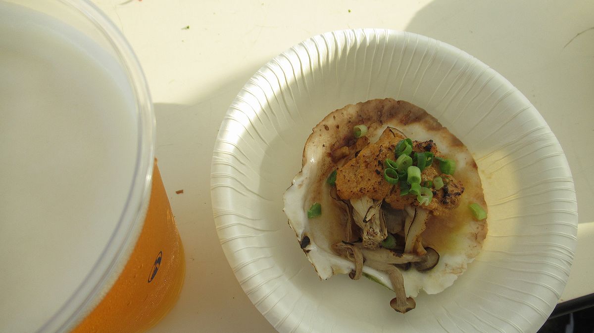 まずいただいたのはあんこうの宿まるみつ旅館のあん肝もつ煮です。これはうまい。ビールが進む。ただ、確かにもう少しあん肝味が強くてもいいかなと思ったら、「追いあん肝」で増量ができたのだとか。いやいや、「追い」を頼むべきでした(^^;) でもうまい。あっという間にビールと共に完食です。